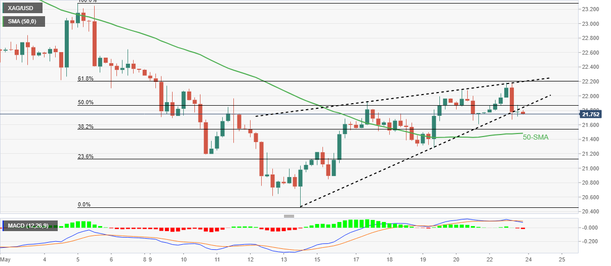 24K99讯 周二(5月24日)亚市盘中,现货白银维持跌势,目前交投在21.70美元/盎司附近。知名财经网站FXStreet分析师Anil Panchal周二最新撰文,对银价技术前景进行分析。Panchal指出,由于技术面传递看空信号,银价恐还要下跌,目标将看向21.00美元/盎司。