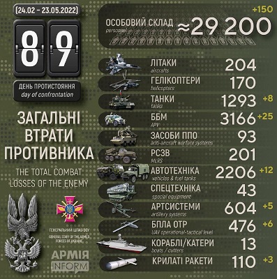 乌克兰国防部在官方推特发文称,自俄罗斯2月24日入侵至5月23日上午6点,俄军已阵亡约2万9200人,乌军摧毁俄军1293辆坦克、3166辆装甲车、604门火炮系统、201辆多管火箭车、93组防空系统、204架军机、170架直升机、2206辆各式车辆&油罐车、13艘舰艇、476架无人机、43个特殊设备以及110枚巡航导弹。