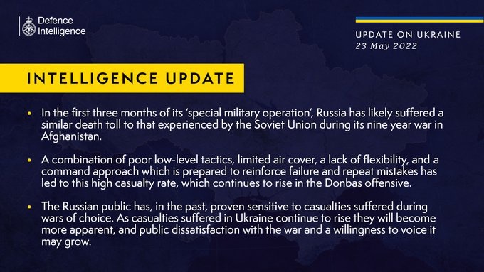 英国国防部周一表示,俄罗斯入侵乌克兰的头三个月“可能遭受了类似于苏联在阿富汗九年战争期间的死亡人数”。