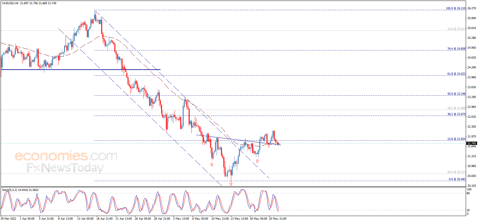 Economies.com预计,今日银价交投将位于支撑位21.50美元/盎司以及阻力位22.30美元/盎司之间。