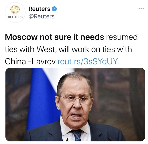 拉夫罗夫说:“既然西方已经采取了‘独裁者的立场’,我们与中国的经济关系将发展得更快。除了为国家预算带来直接收入,这是开发(俄罗斯)远东和东西伯利亚的机会。”中国拥有的信息和通信技术“绝不逊色于西方”,俄中合作“将确保互惠互利”。