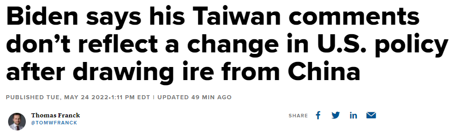 周二,拜登在东京结束与四方领导人的会谈后澄清了他的声明。