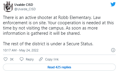 “罗伯小学出现了一名活跃的枪手,”该学区在推特上说。“执法部门正在现场。此时此刻需要你们的配合,请不要来学校。一旦收集到更多信息,就会分享。”