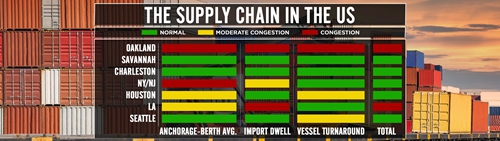 根据MarineTraffic和Blume Global的数据,奥克兰港是最拥堵的港口,船只装卸需要6天时间。进口集装箱在被运走前在港口逗留了将近11天。洛杉矶港是等待时间第2长的港口,集装箱离港需要近12天,船只处理需要5天半。6.2天的铁路延误也影响了港口的生产力。
