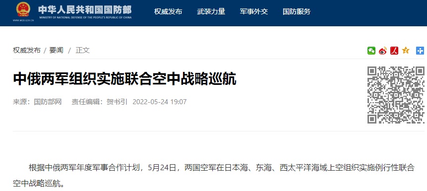 据中国国防部消息,根据中俄两军年度军事合作计划,5月24日,两国空军在日本海、东海、西太平洋海域上空组织实施例行性联合空中战略巡航。