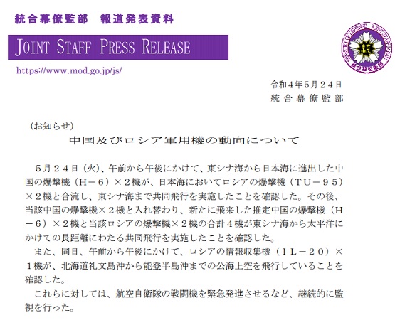 日本共同社称,岸信夫指出,在日美澳印“四边机制”(Quad)首脑会议在东京举行的当天飞行,强调“此举有着针对举办方我国的示威行动的意图,与此前相比,挑衅的程度增大”,岸信夫透露称,已通过外交渠道向两国表达了严重关切。他还指出,在国际社会应对俄罗斯侵略乌克兰的情况下,此举不容忽视。