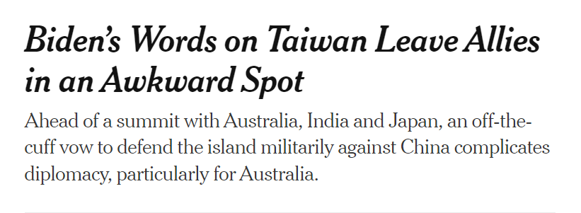 台海新观!纽约时报:拜登承诺防卫台湾掀争议 印太盟友处境尴尬 日本与澳大利亚难响应