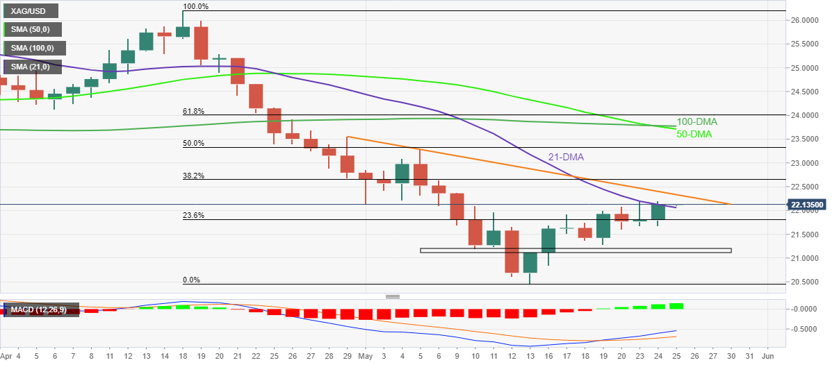 24K99讯 周三(5月25日)亚市盘中,现货白银在昨日大涨后基本持稳,现报22.10美元/盎司附近。知名财经网站FXStreet分析师Anil Panchal周三最新撰文,对银价技术前景进行分析。Panchal称,银价已经突破短期关键移动均线,此外看涨的MACD指标信号也支撑了银价的看涨倾向。