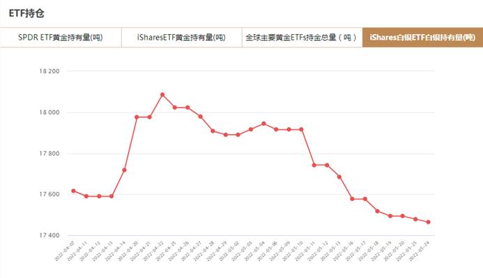 iShares白银ETF5月24日白银持有量为17464.17吨,与上一交易日减少14.35吨。