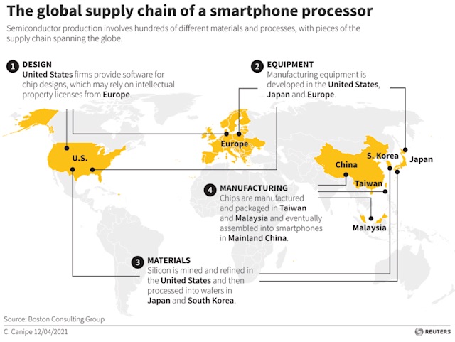 (智能手机的全球半导体供应链的简图 来源:路透)