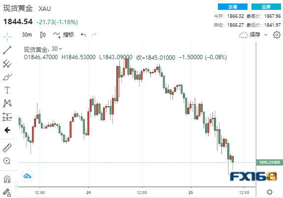 美元上涨令黄金承压,现货黄金日内跌幅超过1%,最低触及1841.97美元/盎司,较日高回落26美元。