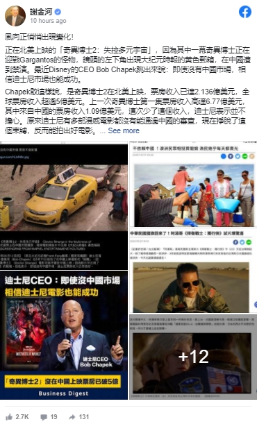 FX168财经报社(北美)讯 漫威电影《奇异博士2:失控多元宇宙》在中国遭到封杀,不过即便除去中国票房,票房仍旧在全球取得佳绩。迪士尼执行长查佩克表示,就算少了中国,也依然不会阻碍他们的成功。对此,财信传媒董事长谢金河表示,未来的世界,可能大家要慢慢适应失去中国14亿市场的新游戏规则。