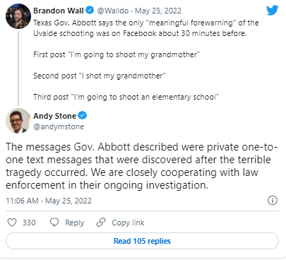 FX168财经报社(北美)讯 周三(5月25日),得克萨斯州州长格雷格·阿博特在记者会上说,在乌瓦尔德市罗布小学开枪的18岁枪手萨尔瓦多·拉莫斯在枪击发生前曾3次在Facebook上发帖。