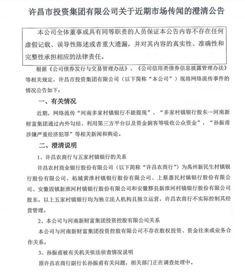 周三(5月25日),许昌农商行实控人许昌市投资集团有限公司发布公告称,河南不能提现的五家村镇银行均为独立法人机构且独立运营,许昌农商行不实际控制其经营管理。