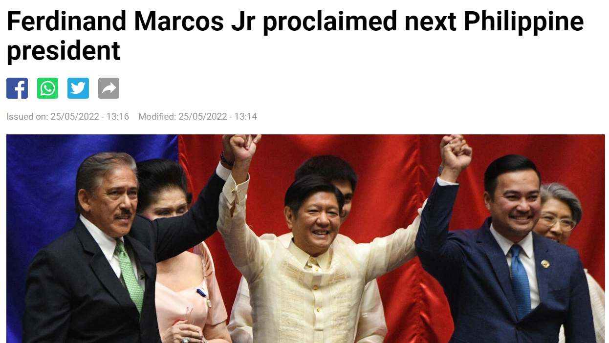 确认马科斯胜选的报告获国会议员批准后,众议院议长费拉斯柯(Lord Allan Velasco)宣布:“本人特此宣布,马科斯正式当选菲律宾共和国总统。”报道提到,他靠着在网路上持续不懈地洗白家族黑暗史,并与在地方上具影响力敌对政治王朝结盟,让家族得以东山再起。