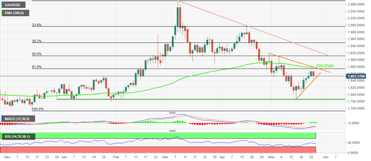 FXStreet分析称,尽管周三结束为期4天的上涨趋势,但从5月16日开始的向上倾斜趋势线限制了黄金的直接下跌,约为1848美元。同样挑战黄金卖家的是,看涨的MACD信号和稳定的RSI(14)。