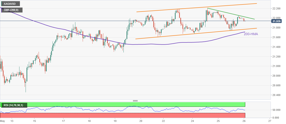 即使银价跌至21.75美元/盎司下方,小时图上200周期均线21.71美元/盎司以及RSI接近50水准仍能令白银买家抱有希望。