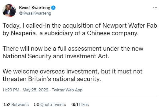 英国商务大臣关浩霆(Kwasi Kwarteng)在推特发文表示,根据2022年上路的英国新《国家安全和投资法》,将对该案进行调查。他写道:“我们欢迎海外投资,但不能威胁到英国的国家安全。”