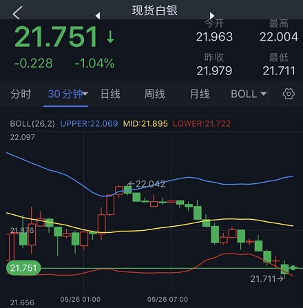 24K99讯 周四(5月26日)亚市尾盘,现货白银扩大跌幅,银价目前跌至21.75美元/盎司附近,日内重挫1%。知名财经资讯网站Economies.com周四最新撰文,对日内白银走势进行前瞻分析。