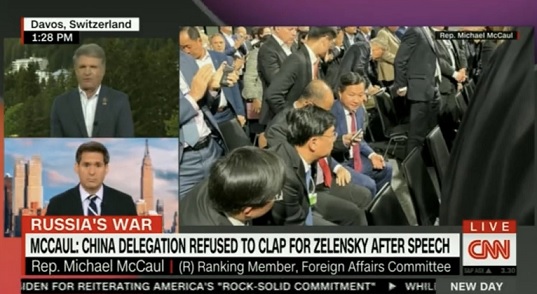 CNN周一(5月23日)报道称,乌克兰总统泽连斯基当天以视频的方式,在世界经济论坛年会上发表演讲,演讲结束后全场起立并鼓掌。但美国会众议员迈克尔·麦考尔(Michael McCaul)表示,中国代表团并未起立鼓掌,而且还离场而去。