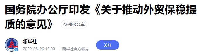 据中国官媒新华社周四(5月26日)报道,中国国务院办公厅印发《关于推动外贸保稳提质的意见》(以下简称《意见》),深入贯彻落实党中央、国务院决策部署,帮扶外贸企业应对困难挑战,实现进出口保稳提质任务目标,助力稳经济稳产业链供应链。