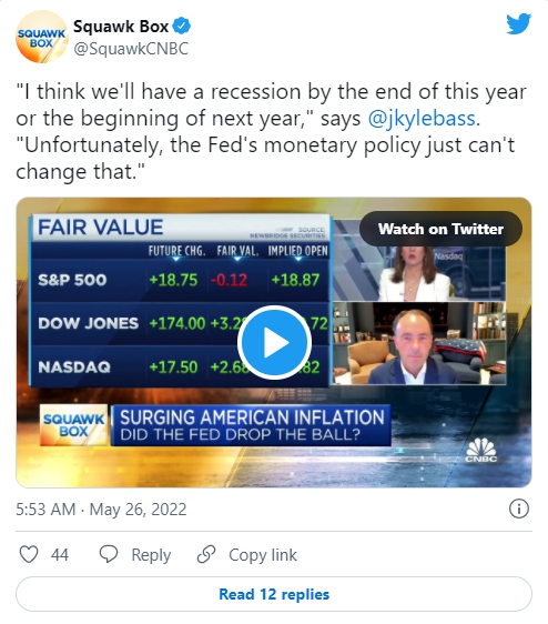 FX168财经报社(北美)讯 周四(5月26日),海曼资本(Hayman Capital)创始人兼首席投资官凯尔·巴斯(Kyle Bass)在接受CNBC采访时表示,他认为美联储将需要在2023年降息。