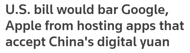由参议员汤姆·科顿(Tom Cotton)、马可·卢比奥(Marco Rubio)和迈克·布劳恩(Mike Braun)于周四公布的法案指出,拥有或控制应用商店的公司“不得在美国境内的应用商店中携带或支持任何支持或允许电子人民币交易的应用程序”。