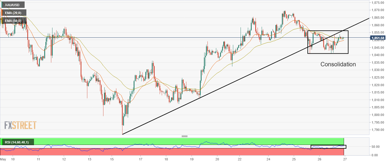 FXStreet技术分析提到,按小时计算,黄金价格在1840.76至1856.35美元的盘整区间内交易,接近5月16日低点1786.94美元的向上倾斜趋势线,紧邻5月19日低点1811.01美元。