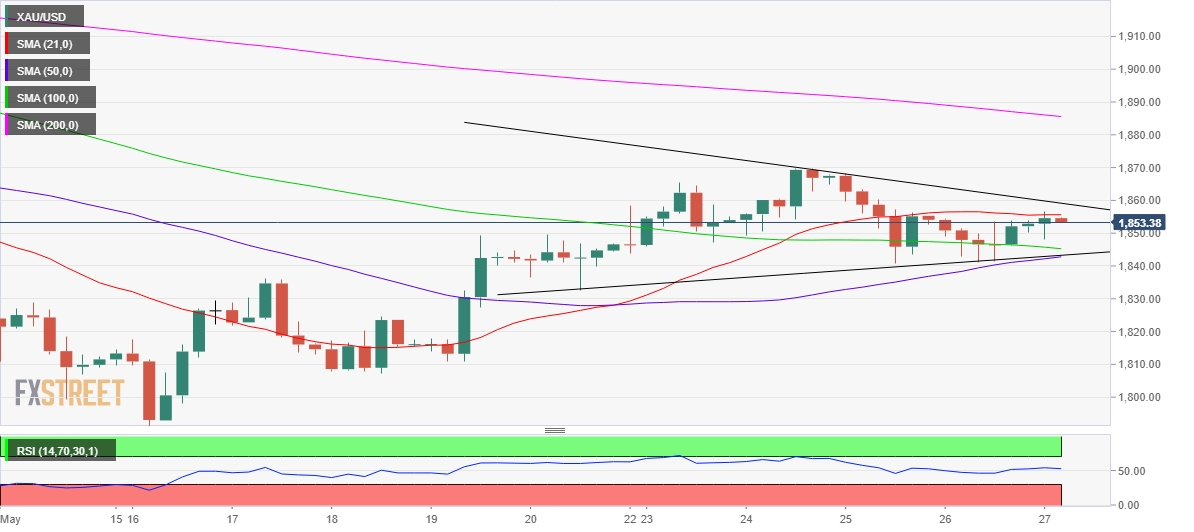 Mehta指出,从4小时图来看,金价保持在一个对称三角形,并成功守住上升趋势线支撑1842美元/盎司。金价也成功捍卫100周期简单移动均线(SMA)1846美元/盎司。相对强弱指数(RSI)在中线上方缓慢上升,这表明对黄金多头来说,逢低买入交易可能仍然存在。