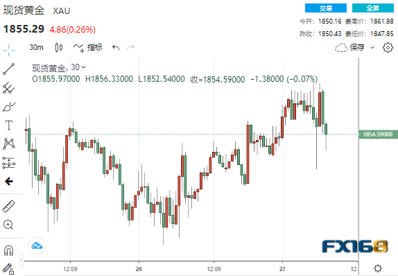 (现货黄金30分钟走势图,来源:FX168)