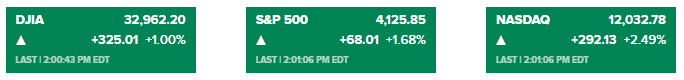 道指上涨370点或涨幅1.2%,标准普尔500指数上涨1.8%,以科技股为主的纳斯达克综合指数上涨2.6%,主要得益于软件公司的强劲盈利和10年期美国国债收益率的下跌。