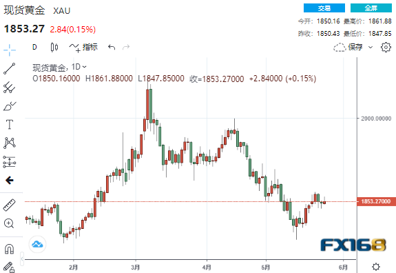 COMEX 6月黄金期货收涨0.20%,报1851.30美元/盎司,本周累涨约0.45%。