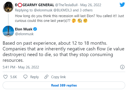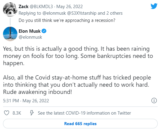 当一位推特用户问马斯克是否认为会出现经济衰退时,马斯克回答说:“是的,但这其实是件好事。把钱撒在傻瓜身上已经太久了。”