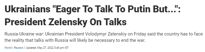 FX168财经报社(北美)讯 周五(5月27日),乌克兰总统泽连斯基说,乌克兰并不急于与俄罗斯总统普京对话,但是乌克兰必须面对这样一个现实,这对结束战争可能是必要的。