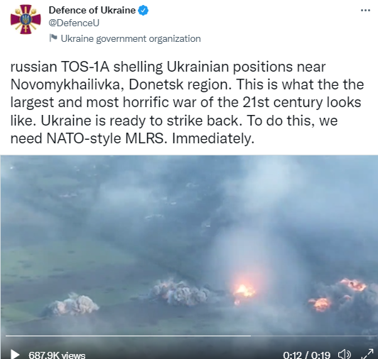 乌克兰内政部长幕僚格拉申科(Anton Gerashchenko)在推特发布视频,并称它们摧毁所有人,甚至连战壕里的也不例外。乌克兰迫切需要M270多管火箭系统,或是M142高机动性多管火箭系统来挽救乌克兰士兵的生命,并阻止俄罗斯的攻击。