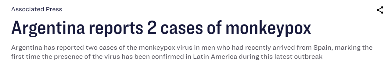 据阿根廷卫生部声明中所称,在提到阿根廷的第一起猴痘病例时指出,聚合酶连锁反应(PCR)的检测结果是阳性,患者情况良好,曾有密切接触的人都在临床和流行病学的监控下,目前为止并没有症状。