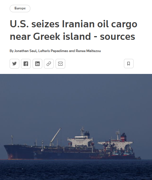 希腊扣押佩嘉斯号后,美国没收船上的伊朗石油,并计划将这些石油货物用其他船只运往美国。佩嘉斯号之后虽获放行,但石油一去不返,伊朗国安机构相关新闻网Nour News周五在推特称,“在希腊扣押一艘伊朗油轮、并将石油移转给美国后,伊朗决定对希腊采取惩罚措施”。