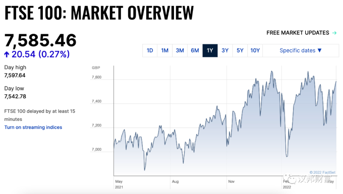 本周五,英国FTSE 100指数以7585.46收盘,较上周上涨2.65%。