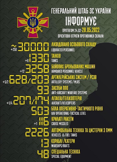 乌克兰国防部在官方推特发文称,自俄罗斯2月24日入侵至5月28日上午6点,俄军已阵亡约3万人,乌军摧毁俄军1330辆战坦克、3258辆装甲车、628门火炮系统、203辆多管火箭车、93组防空系统、207架军机、174架直升机、2226辆各式车辆&油罐车、13艘舰艇、503架无人机、48个特殊设备以及116枚巡航导弹。