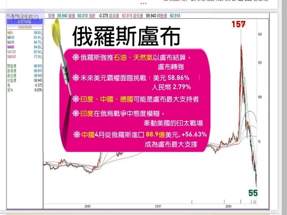 谢金河周六(5月28日)在脸书上发文指出,俄罗斯入侵乌克兰后,欧美开始对俄罗斯采取全方位的经济制裁,俄罗斯股市一度暂停交易,卢布一度重跌,盘中最低跌到177.26兑一美元,后来俄罗斯央行行长找到“救生圈”,要求要向俄罗斯买原油及天然气的国家必须使用卢布,现在又进一步扩展到粮食。这形成俄罗斯的活口,也就是说,要向俄罗斯购买石油,天然气及粮食的国家,必须先把外币兑换成卢布,如此一来,卢布几乎没有卖盘,只有买盘,形成卢布一路涨升的景象。