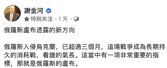 FX168财经报社(香港)讯 俄罗斯入侵乌克兰已超过三个月,这场战争成为长期持久的消耗战。无人知晓战争何时能结束,不过被誉为“台湾财经第一名人”的财信传媒董事长谢金河指出,俄罗斯卢布是一个重要的观察指标。