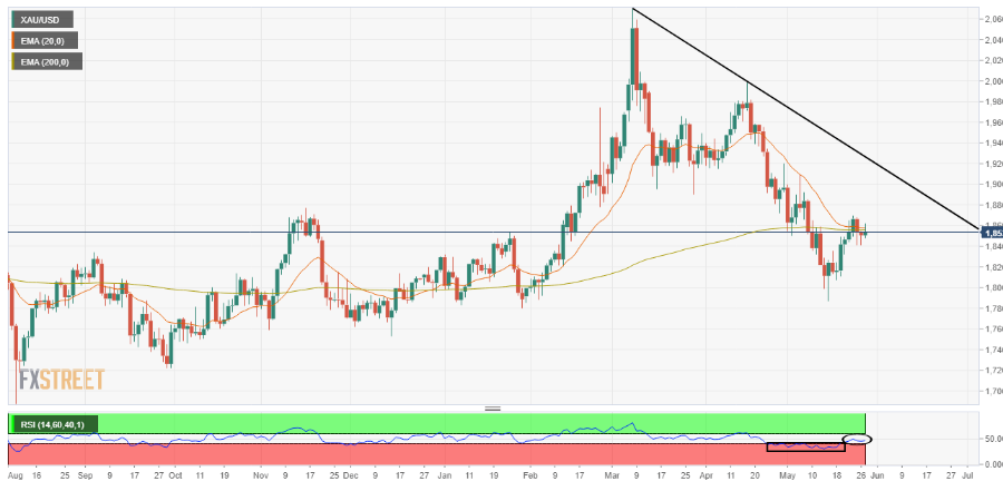 在每日范围内,黄金多头已经攻击200周期指数移动平均线(EMA)的1856.60美元。考虑到日线图上的走势,1855美元附近的20与200 EMA的空头交叉看起来很可能。然而,相对强弱指数(RSI)(14)显示出另一种行动。RSI(14)已从20至40的看跌范围,转变为40至60范围,这减少下行偏见。在解释空头交叉和中性RSI(14)之后,未来可能出现盘整走势。