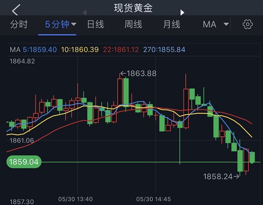 (现货黄金5分钟图 来源:FX168)