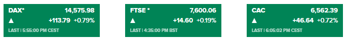 德国DAX30指数收盘上涨114.73点,涨幅0.79%,报14576.92点;英国富时100指数收盘上涨16.79点,涨幅0.22%,报7602.25点;法国CAC40指数收盘上涨46.64点,涨幅0.72%,报6562.39点;欧洲斯托克50指数收盘上涨34.29点,涨幅0.90%,报3843.15点。