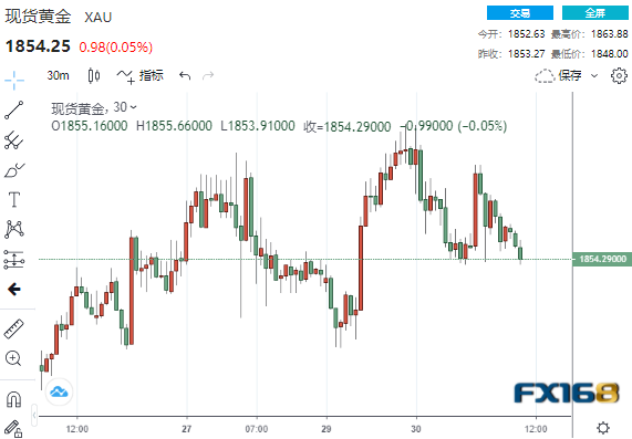 (现货黄金30分钟走势图,来源:FX168)