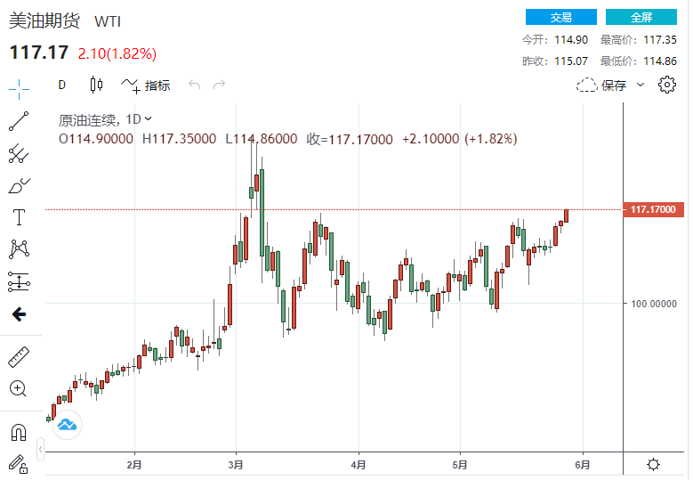 截至发稿,美国WTI原油期货上行2.05美元,涨幅1.79%,现报117.14美元/桶;布伦特原油期货上探2.47美元,涨幅2.07%,报121.67美元/桶。