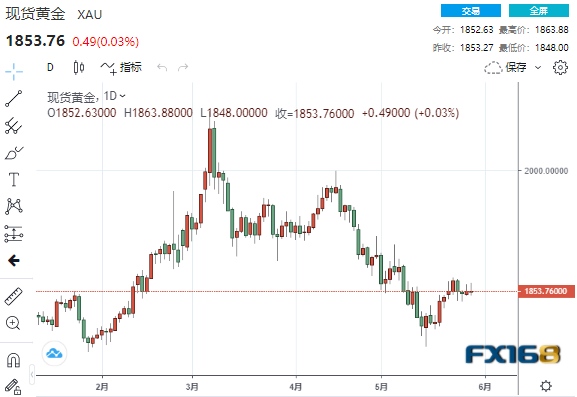 美市尾盘,现货黄金收报1853.76美元/盎司,微幅上涨0.49美元或0.03%,日内最高触及1863.88美元/盎司,最低触及1848.00美元/盎司。上周,现货黄金小幅上涨7.05美元或0.38%。
