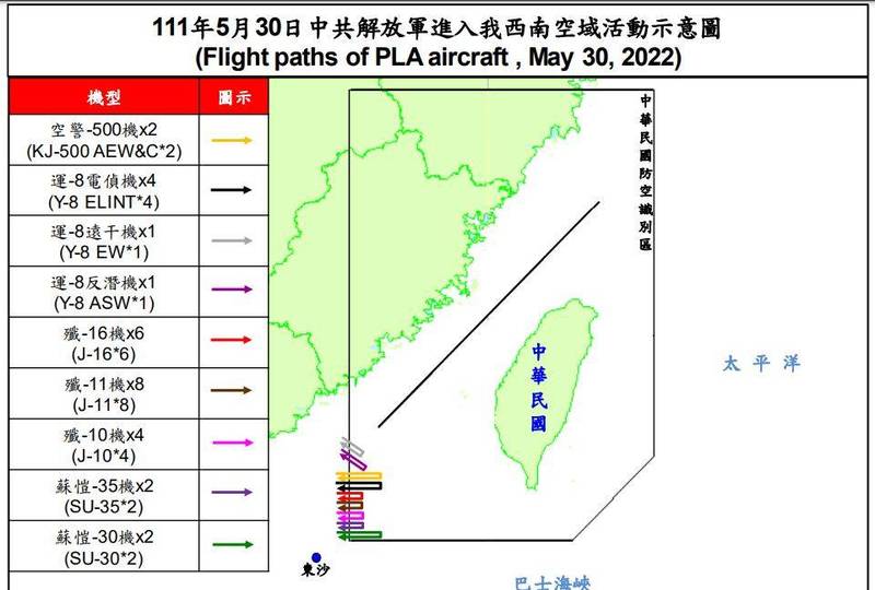 FX168财经报社(北美)讯 当地时间周一(5月30日)晚间,台湾防务部门发布即时军事动态,称中国解放军当日派遣30架次军机进入台西南空域,且全数于东沙岛东北方空域活动,架次数创今年第2高纪录。台湾空军依照惯例,派遣空中巡逻兵力应对、广播驱离、防空飞弹追监。