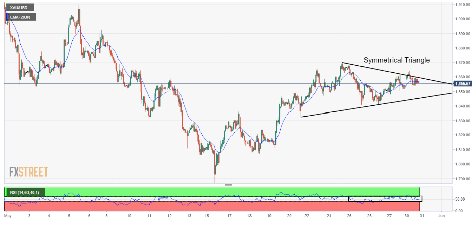 FXStreet提到,在每小时的尺度上,黄金价格正在形成一个对称三角形,表明波动性出现滑点,随后出现突破。