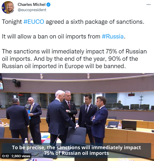 FX168财经报社(香港)讯 欧盟第6轮制裁俄罗斯措施初步出台,结果此次真的狼来了,到今年年底,将禁止从欧洲进口的90%的俄罗斯石油。欧洲理事会主席米歇尔(Charles Michel)盛赞成员国,称此次举措是伟大的成就。另外,理事会也将向乌克兰捐款90亿欧元。